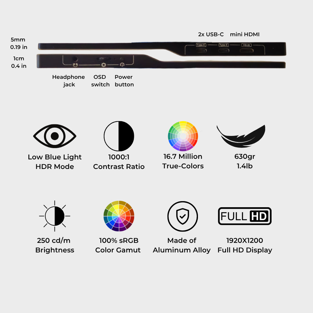 Weighing just 1.4 lb (630 g), and with a slim profile, this monitor fits easily into any backpack or laptop bag, making it the perfect travel companion.